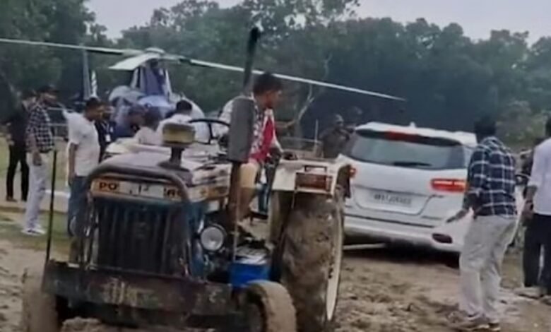 तेजस्वी यादव की गाड़ी कीचड़ में फंसी, हेलीपैड के निकट, ट्रैक्टर का लिया सहारा