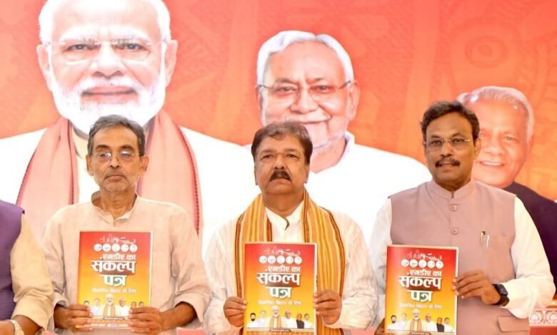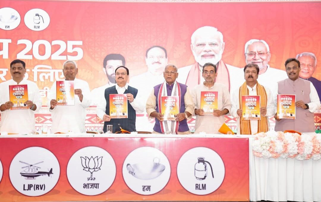 पटना। बिहार विधान सभा चुनाव 2025 के लिए एनडीए द्वारा साझा संकल्प पत्र मुख्य मंत्री नीतीश कुमार, उप मुख्यमंत्री सम्राट चौधरी, बिहार भाजपा प्रदेश अध्यक्ष डॉ दिलीप जायसवाल, केंद्रीय मंत्री सह हम सुप्रीमो जीतन राम मांझी, केंद्रीय मंत्री सह लोजपा सुप्रीमो चिराग पासवान, राष्ट्रीय लोक मोर्चा सुप्रीमो उपेन्द्र कुशवाहा, नितीन नवीन आदि ने जारी किया। बिहार के विकास से संबंधित कई योजनाओं का कार्यान्वयन समय करने का वायदा भी किया गया। बिहार विधानसभा चुनाव के लिए एनडीए ने अपना साझा चुनावी घोषणा पत्र जारी कर दिया है। एनडीए संकल्प पत्र में रोजगार, विकास, शिक्षा, स्वास्थ्य से जुड़े 25 प्रमुख वादे किए गए हैं। इस दौरान मुख्यमंत्री एवं जेडीयू अध्यक्ष नीतीश कुमार, भाजपा के राष्ट्रीय अध्यक्ष जेपी नड्डा, लोजपा (रामविलास) के मुखिया चिराग पासवान, हिंदुस्तान आवाम मोर्चा (हम) के सुप्रीमो जीतनराम मांझी और राष्ट्रीय लोक मोर्चा (आरएलएम) के चीफ उपेंद्र कुशवाहा समेत एनडीए के अन्य नेता मौजूद रहे। बिहार एनडीए के संकल्प पत्र के प्रमुख वादे- 1 करोड़ सरकारी नौकरी एवं रोजगार कौशल जनगणना करके कौशल आधारित रोजगार प्रदान किए जाएंगे। हर जिले में मेगा स्किल सेंटर स्थापित करके बिहार को ग्लोबल स्किलिंग सेंटर के रूप में स्थापित किया जाएगा। मुख्यमंत्री महिला रोजगार योजना के तहत महिलाओं को 2 लाख रुपये तक की सहायता राशि दी जाएगी। एक करोड़ महिलाओं को ‘लखपति दीदी’ बनाया जाएगा। ‘महिला मिशन करोड़पति’ के माध्यम से चिह्नित महिला उद्यमियों को करोड़पति बनाने की दिशा में काम किया जाएगा। अतिपिछड़ा वर्ग के विभिन्न व्यावसायिक समूहों को 10 लाख रुपये की सहायता दी जाएगी। सुप्रीम कोर्ट के रिटायर्ड जज की अध्यक्षता में एक उच्च स्तरीय समिति का गठन किया जाएगा, जो अतिपिछड़ा वर्ग की विभिन्न जातियों के सामाजिक और आर्थिक स्थिति का आकलन करके उनके सशक्तीकरण के लिए न्यायोचित कदम उठाने हेतु सरकार को सुझाव देगी। हर किसान का सम्मान, हर फसल का सही दाम। कर्पूरी ठाकुर किसान सम्मान निधि की शुरुआत करके किसानों को प्रति वर्ष 3000 रुपये, कुल 9,000 रुपये का लाभ दिया जाएगा।एग्री-इंफ्रास्ट्रक्चर में ₹1 लाख करोड़ का निवेश किया जाएगा। पंचायत स्तर पर सभी प्रमुख फसलों (धान, गेहूं, दलहन, मक्का) की एमएसपी पर खरीद की जाएगी। ‘मत्स्य-दुग्ध मिशन’ योजना से प्रत्येक मत्स्य पालक को कुल 9,000 रुपये का लाभ दिया जाएगा। ‘बिहार दुग्ध मिशन’ की शुरुआत करके हर प्रखंड स्तर पर चिलिंग व प्रोसेसिंग सेंटर्स स्थापित किए जाएंगे। 5 मेगा फूड पार्क स्थापित किए जाएंगे और कृषि निर्यात दोगुना किया जाएगा। 2030 तक दलहन उत्पादन में आत्मनिर्भरता प्राप्त की जाएगी। बिहार गति शक्ति मास्टर प्लान 