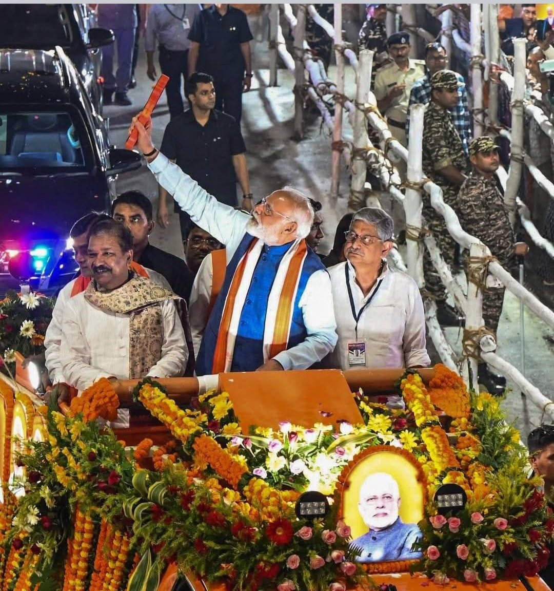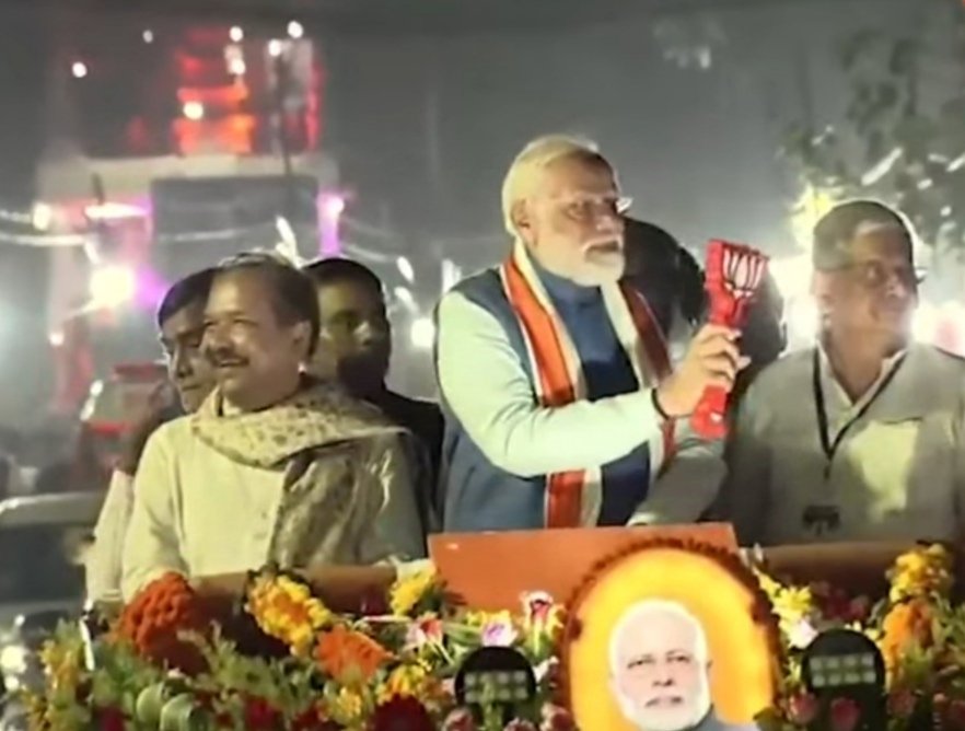 मेगा रोड शो में जीप पर सवार पीएम नरेन्द्र मोदी के साथ भाजपा प्रदेश अध्यक्ष डॉ दिलीप जायसवाल और जदयू के ललन सिंह भी रहे मौजूद