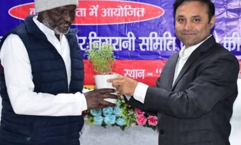 बैठक की अध्यक्षता कर रहे सांसद अजय कुमार मंडल का डीएम डॉ नवल किशोर चौधरी ने पौधा भेंट कर किया स्वागत