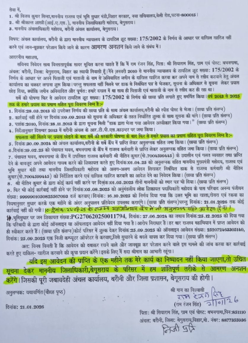 पीड़ित ने राजस्व मंत्री विजय कुमार सिंहा तथा डीएम, बेगुसराय को दे दिया लिखित अल्टीमेटम