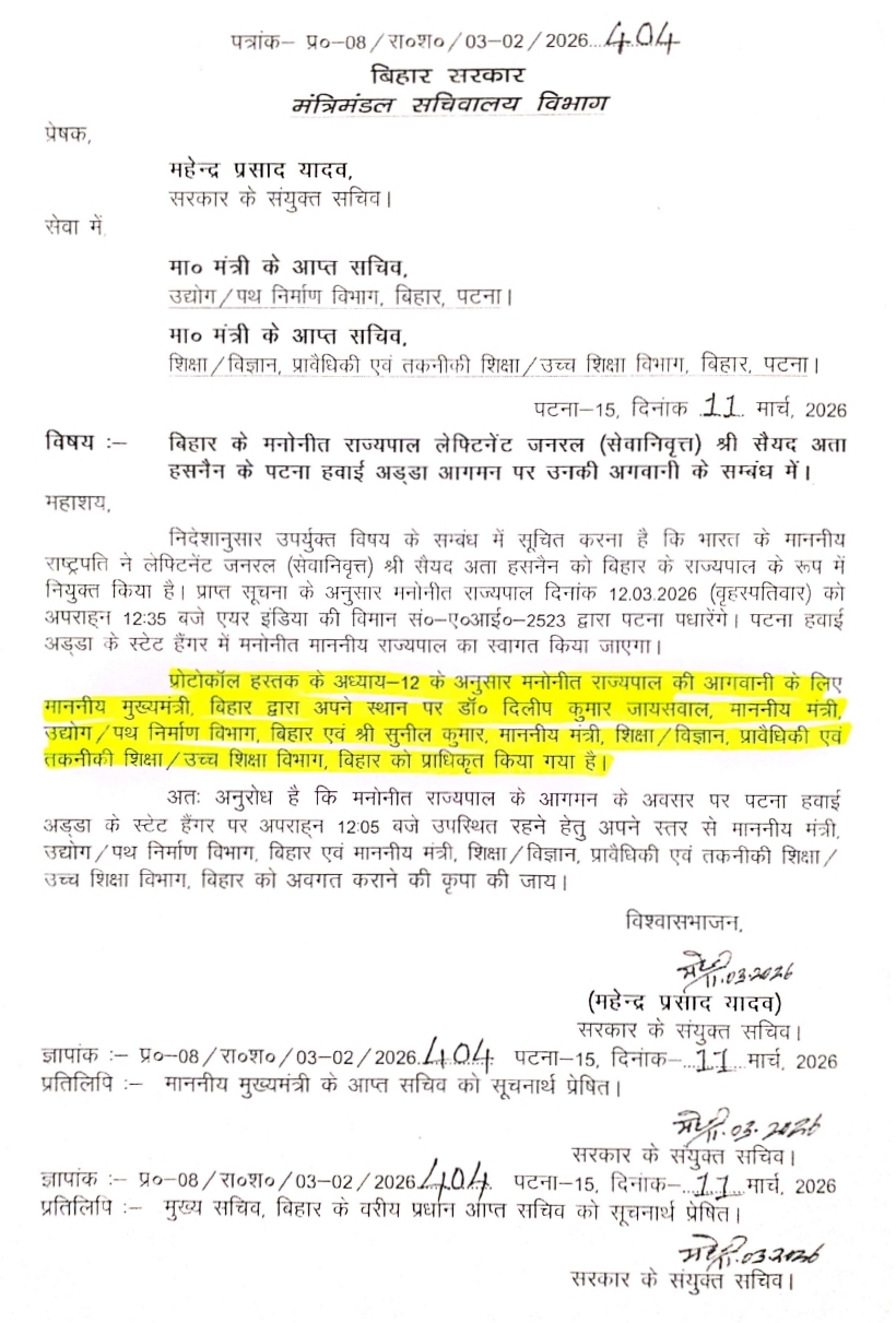 पटना। बिहार के नए राज्यपाल लेफ्टिनेंट जनरल (सेवानिवृत) सैयद अता हसनैन के पटना हवाई अड्डा आगमन पर उनकी अगवाई मुख्य मंत्री नीतीश कुमार की तरफ़ से बिहार सरकार के उद्योग एवं पथ निर्माण मंत्री डॉ दिलीप जायसवाल एवं शिक्षा/विज्ञान, प्रावैधिकी एवं तकनीकी शिक्षा/उच्च शिक्षा विभाग मंत्री सुनील कुमार ने किया। सनद रहे, भारत के राष्ट्रपति ने बिहार के नए राज्यपाल के रूप में लेफ्टिनेंट जनरल (सेवानिवृत) सैयद अता हसनैन को नियुक्त किया है। एयर इंडिया की विमान संख्या – एo आईo- 2523 द्वारा पटना पहुंचे, जिनका हवाई अड्डा के स्टेट हैंगर में उद्योग एवं पथ निर्माण मंत्री डॉ दिलीप जायसवाल तथा मंत्री सुनील कुमार ने राज्यपाल का स्वागत किया। प्रोटोकॉल हस्तक के अध्याय – 12 के अनुसार मुख्य मंत्री नीतीश कुमार ने राज्यपाल की अगवाई के लिए दो मंत्री डॉ दिलीप जायसवाल और सुनील कुमार को प्राधिकृत किया था। पटना आगमन पर बिहार के नवनियुक्त महामहिम राज्यपाल लेफ्टिनेंट जनरल (सेवानिवृत्त) सैय्यद अता हसनैन का पुष्पगुच्छ भेंट कर हार्दिक स्वागत एवं अभिनन्दन किया। मौके पर उपस्थित मीडिया से उद्योग एवं पथ निर्माण मंत्री डॉ दिलीप जायसवाल ने कहा नए राज्यपाल महोदय का गौरवपूर्ण सैन्य अनुभव, अनुशासन और राष्ट्रसेवा के प्रति समर्पण निश्चित ही बिहार के प्रशासनिक और सामाजिक जीवन को नई ऊर्जा प्रदान करेगा। आगे उन्होंने कहा मुझे पूर्ण विश्वास है कि नए राज्यपाल महोदय के मार्गदर्शन में राज्य सुशासन, विकास और जनकल्याण के पथ पर और अधिक सशक्त रूप से आगे बढ़ेगा।